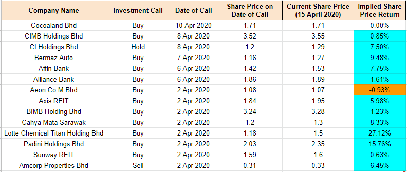 For the Malaysian companies I am keeping track with a Buy call, most of them are up in contrast with the general market. The best performing companies in terms of share price are Lotte Chemical Titan (27.1%), Padini (15.8%) and Bermaz Auto (9.5%). To date, the portfolio of companies I am keeping track on have improved to 5.5% return (15 April 2019: 3.2%). You can have a look at the companies I am keeping track on in the Google Excel sheet here or the table below.