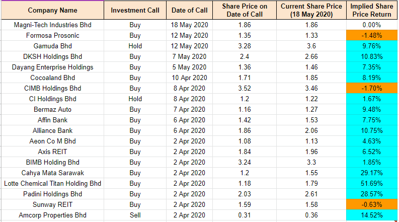 For the Malaysian companies I am keeping track, most of them are still up. The best performing companies in terms of share price are Lotte Chemical Titan (51.7%), Padini (28.6%) and DKSH Holdings (10.8%). To date, the portfolio of companies I am keeping track on have improved to 8.9% return (15 May 2020: 7.0%). You can have a look at the companies I am keeping track on in the Google Excel sheet here or the table below.