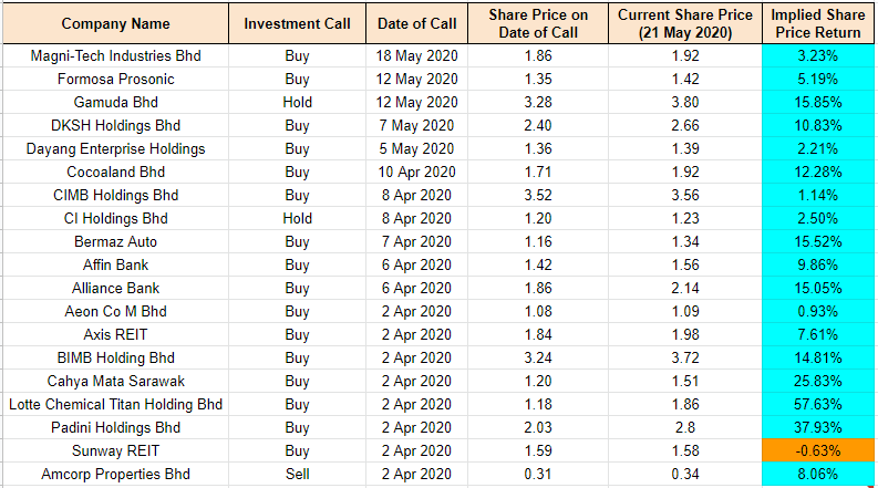 For the Malaysian companies I am keeping track, most of them are still up. The best performing companies in terms of share price are Lotte Chemical Titan (57.6%), Padini (37.9%) and Cahya Mata Sarawak(25.8%). To date, the portfolio of companies I am keeping track on have improved to 12.6% return (20 May 2020: 10.9%). You can have a look at the companies I am keeping track on in the Google Excel sheet here or the table below.