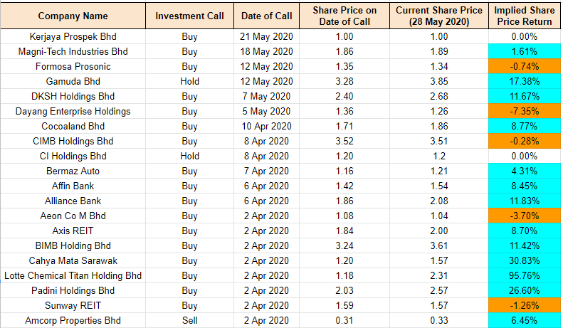 For the Malaysian companies I am keeping track, most of them are still up. The best performing companies in terms of share price are Lotte Chemical Titan (95.8%), Padini (26.6%) and Cahya Mata Sarawak(30.8%). To date, the portfolio of companies I am keeping track on have improved to 11.1% return (27 May 2020: 10.3%). You can have a look at the companies I am keeping track on in the Google Excel sheet here or the table below.