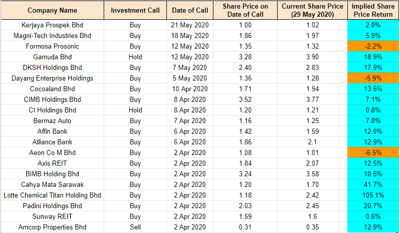 For the Malaysian companies I am keeping track, most of them are still up. The best performing companies in terms of share price are Lotte Chemical Titan (105.1%), Padini (20.7%), Cahya Mata Sarawak(41.7%), Gamuda (18.9%) and DKSH(17.9%). To date, the portfolio of companies I am keeping track on have improved to 13.8% return (28 May 2020: 11.1%). You can have a look at the companies I am keeping track on in the Google Excel sheet here or the table below.