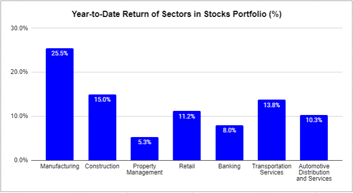 In my last monthly update here, I highlighted that the stocks portfolio I am covering have higher returns than the overall market, and that certain sectors such as Manufacturing, Construction, Technology, Utilities and Media have higher rates of rebound in share price than other sectors. I will be updating on these 2 points chiefly.