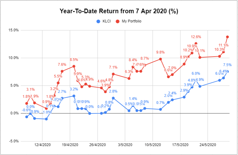 In these 2 months, my stocks portfolio averaged returns of 7.0% compared to KLCI’s average return of 2.1%. The portfolio’s return have further outpaced KLCI’s returns by 4.9% compared to April’s returns (+3.7%). While the portfolio’s risk is higher at a standard deviation of 3.4% (KLCI: 2.5%), the 95% confidence interval indicates that the portfolio (5.4% to 8.6%) outperforms the general market (0.9% to 3.4%).