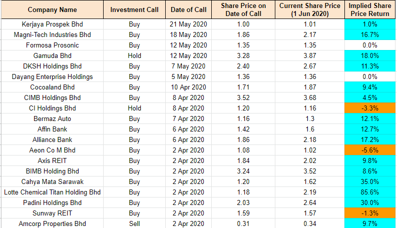 For the Malaysian companies I am keeping track, most of them are still up. The best performing companies in terms of share price are Lotte Chemical Titan (85.6%), Padini (30.0%), Cahya Mata Sarawak(35.0%), Gamuda (18.0%) and DKSH(11.3%). To date, the portfolio of companies I am keeping track on have moderated to 13.2% return (1 Jun 2020: 12.3%). You can have a look at the companies I am keeping track on in the Google Excel sheet here or the table below.
