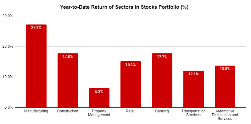 From a sectoral point of view, the manufacturing stocks in my portfolio continues to outperform the other sectors, registering 27.2% returns to date. This is followed by Construction (+17.8%), Banking (+17.7%), and Retail (+15.1%).