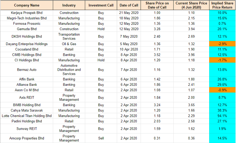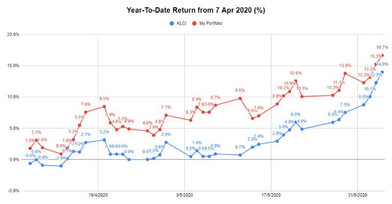 To date, the portfolio of companies I am keeping track on has improved to 16.7% return (3 Jun 2020: 15.3%), outperforming the KLCI index at 14.0%. This indicates an alpha of +2.7% for today (3 Jun 2020: +3.0%). (Note: Alpha is a measure of how much higher or lower the portfolio performs against the market. A positive alpha indicates that the portfolio outperforms the market and vice versa)