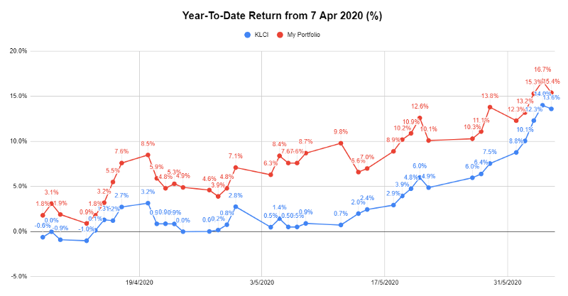 To date, the portfolio of companies I am keeping track on has moderated to 15.4% return (4 Jun 2020: 16.7%), outperforming the KLCI index at 13.6%. This indicates an alpha of +1.8% for today (4 Jun 2020: +2.7%). (Note: Alpha is a measure of how much higher or lower the portfolio performs against the market. A positive alpha indicates that the portfolio outperforms the market and vice versa). The recent narrowing of the alpha indicates that the broader market is starting to recover fully.