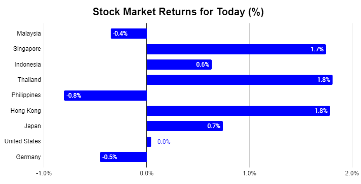 The Kuala Lumpur Composite Index (KLCI) today retreated by 0.4% to end at 1,556 points, still above the 1,500 level. Elsewhere in Asia, most markets were up especially Singapore (+1.7%), Thailand (+1.8%), Hong Kong (+1.8%) and Japan (+0.7%). The US market (+0.0%) took a breather today, unchanged from yesterday, while the Germany market (-0.5%) declined.