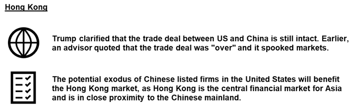 - The Hong Kong market gained the most today due to the confirmation by Trump that the US-China trade deal is still intact, and the potential listings of more Chinese firms in the Hong Kong market.