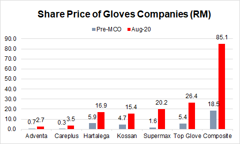 It is fair to say that much of the upwards performance of the Malaysian stock market was due to everyone piling onto gloves stocks. Gloves companies gained almost 359% since the MCO, aided by the retail frenzy for glove companies. Even less established glove companies who were penny stocks (Adventa, Careplus), are now trading like they are big boys in the market.