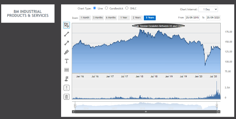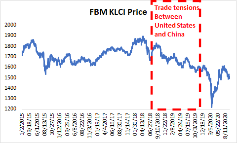 The stock market index back in 2018 and 2019 suffered from the trade tensions dragging the KLCI down. The manufacturing sector in particular which exported most of its products worldwide were affected considerably. The Bursa Malaysia Industrial Products and Services which is a proxy to the manufacturing sector declined gradually throughout 2018 and 2019.
