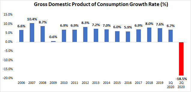 With those out of the way, the amount of consumption in Malaysia has been very steady, growing at an average of 6.9% the last 5 years. However, we need to take note of 2 significant developments from 2014 to 2019, the introduction and subsequent abolishment of Goods and Services Tax in 2014 and 2018. 2015 and 2016 growth rate was much lower due to introduction of GST, and 2018 growth was much stronger due to abolishment of GST. Additionally, 2Q 2020 is a really bad quarter due to the Movement Control Restrictions.