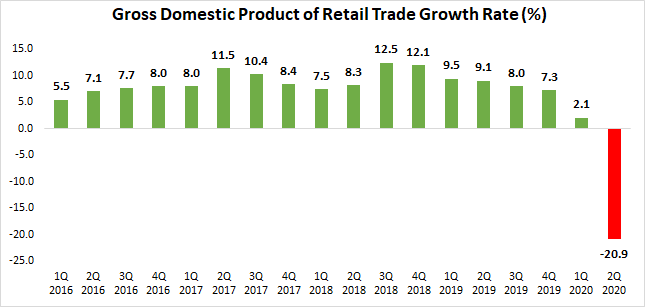 Digging deeper into the individual segments, the retail trade sector has been moderating (growth rate decreasing, a growth rate from 5% to 4% is called moderation), since the abolishment of GST in the 2nd half of 2018. This is to be expected as many people rushed to buy things during this period before the introduction of SST by the new government. However, it does seem like the segment was doing very well from 2016 to 2017, which might reflect the fact that consumers were starting to spend more after the introduction of GST in 2015. In the 1st half of 2020, the segment was hit hard by the movement control restrictions order.