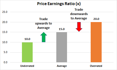 As a rule of thumb, 15.0x is the average price earnings ratio companies typically trade at. This means that a company that has a 10.0x price earnings ratio is underrated and should trade to an average of 15.0x to be considered “fair”. If the company trades at 20.0x, it is considered overrated, and should trade back to 15.0x.
