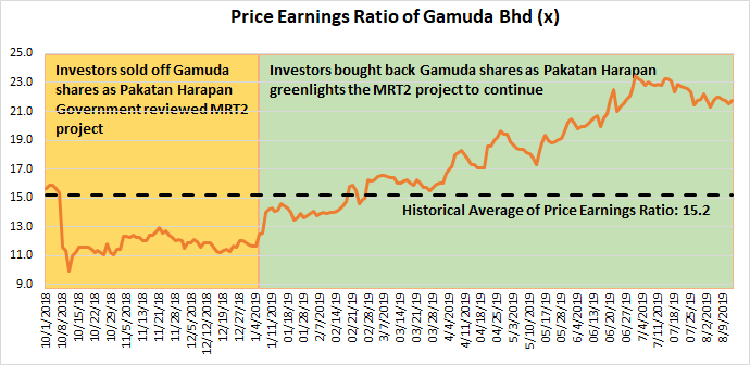 - Gamuda initially traded at below its historical price earnings ratio of 15.2x towards the 2nd half of 2018 due to Pakatan Harapan’s review/potential cancellation of the MRT2 project. Investors quickly sold off Gamuda shares (driving share price down, and also price earnings ratio) as they view that profits might decline in the future if Pakatan Harapan cancelled MRT2.
