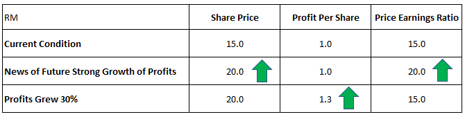 There are some companies who trade at higher price earnings ratio, and stay that way for a while. This is because investors expect that the company’s profits will grow strongly in the future and hence, buy more and more shares of the company, driving prices up. The price earnings ratio will then increase as the share price increase with its current profits per share remaining the same. Remember the Price Earnings Ratio above, but share price will increase with the current profits per share remaining the same.
