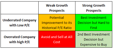 This is important. The best kind of investments are companies that are underrated with low price earnings ratio (cheap to buy) and strong future growth prospects. However, these companies are difficult to find as research into such companies require substantial amount of research and luck. The next best thing would be to buy companies that have high price earnings ratio and also strong growth prospects. This will be easier to find as these companies are more visible to most investors.