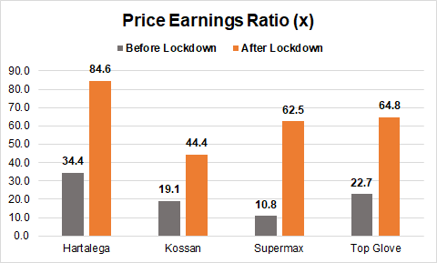 The graph below shows how the 4 companies of Hartalega, Kossan Rubbers, Supermax and Top Gloves fared before and after the MCO lockdown. The companies’ price earnings ratio rose to astronomical valuations making them highly speculative in nature.