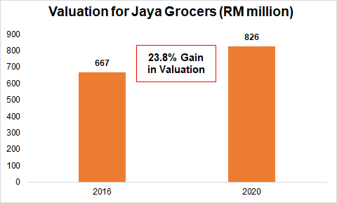 There are no financial data yet on Jaya Grocer so it is hard to judge whether this valuation is feasible. AIGF reportedly invested RM300 million in May 2016, for a stake of 45%, which indirectly puts Jaya Grocers valuation at RM667 million. This means that Jaya Grocer would have gained 23.8% in total from 2016, or a 5.5% yearly gain.