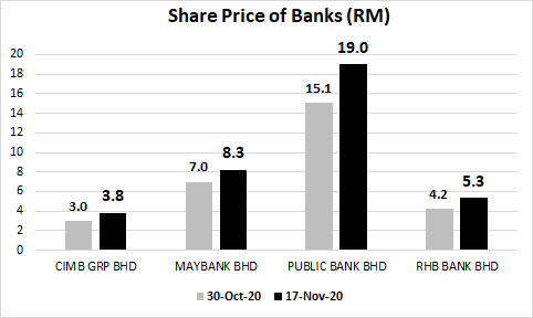 I did mull whether to enter into positions for banking stocks when Bank Negara didn’t reduce interest rates as they were still trading at very low valuations. I opted to wait for 3Q GDP results to come out, but I did not anticipate news of vaccines from the United States being over 90% effective to come out before the GDP announcement. That news alone brought the KLCI and banking stocks roaring upwards.