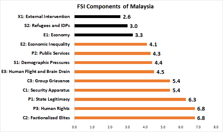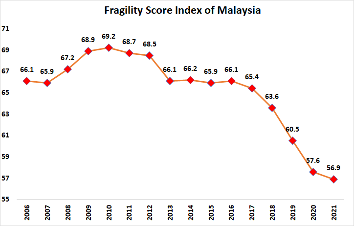 Since the publication of the FSI, Malaysia’s FSI has actually improved (declined) from its peak of 69.2 in 2010 to 56.9 currently. It is interesting to note that Malaysia’s FSI score was highest during the late 2000s and early 2010s. If you recall back, 2008 was the turning point in Malaysia’s political scene when the ruling coalition lost its two-thirds majority. The reign after that saw the removal of Badawi and the appointment of Najib Razak, which sparked the 1MDB saga later. Malaysia’s performance improved drastically when the ruling government was defeated in 2018 and onwards. The emergence of a two-party state greatly enhanced the economic and security aspect of Malaysia.