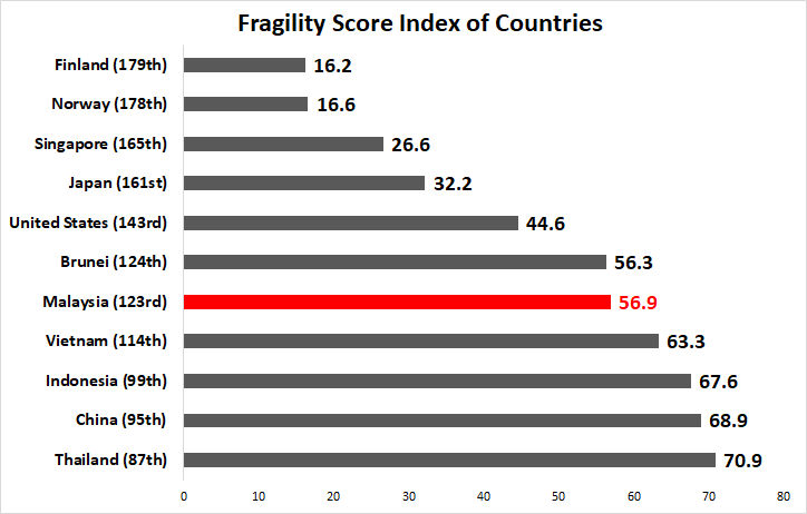 Believe it or not, Malaysia is actually considered very decent in the rankings. As of the latest data in 2021, Malaysia scores 56.9 on the FSI, ranking it123rd out of 179. For context, the lower the score, the higher the ranking. This leaves Finland the best country at 179th ranking. The worst failed state in the ranking is Yemen with a score of 111.7, in the 1st position. Remember, the lower the score, the better. The only countries in the region that performs better than Malaysia is Singapore scoring a 26.6 on the FSI and ranking at 165th, and Brunei scoring a 56.3 at 124th position. Vietnam scores 67.6 and ranks 114th, while Indonesia is at 99th and Thailand is at 87th.