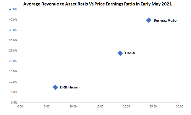 In early May 2021, investors seem to have selected Bermaz Auto as their favored investment as it traded at a high price earnings ratio of 22 times to 24 times. Companies in Malaysia normally trade around 12 times to 15 times. A higher price earnings ratio than that implies that investors are positive on the company, while a lower price earnings ratio implies investors are negative. DRB Hicom traded the lowest price earnings ratio of 6.6 times initially, while UMW traded at 18.9 times.