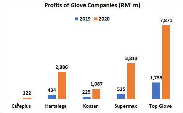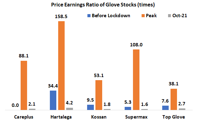 The rocket for gloves stock sped through the atmosphere in the pandemic period of 2020, rising through the roof for the companies of Careplus, Hartalega, Kossan, Supermax and Top Glove. Careplus had the biggest increase from Jan 2020 to its peak in Aug 2020, rising by 1746% from being an obscure glove company to one of the best performers in share price during this period. This was followed by Supermax (1326%), Top Glove (426%), Kossan (275%), and finally Hartalega (214%).