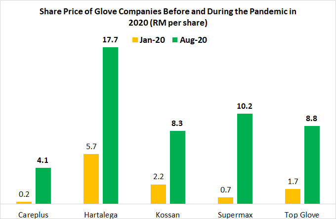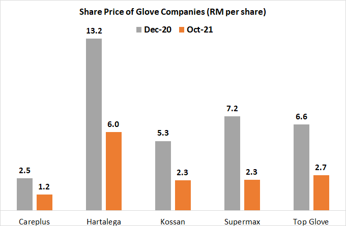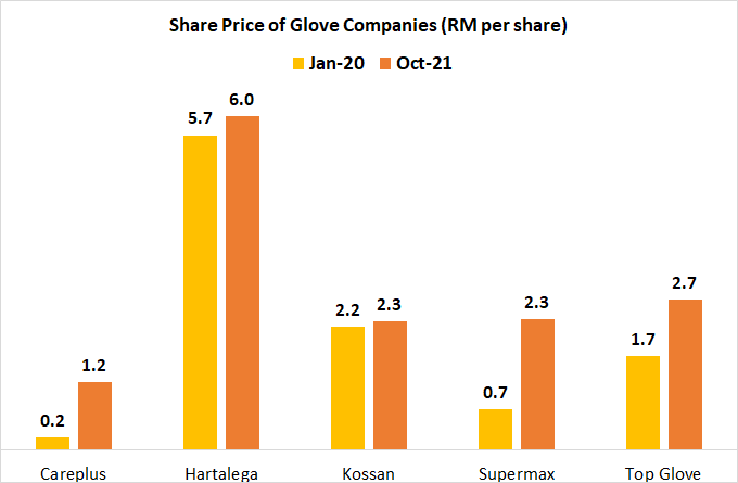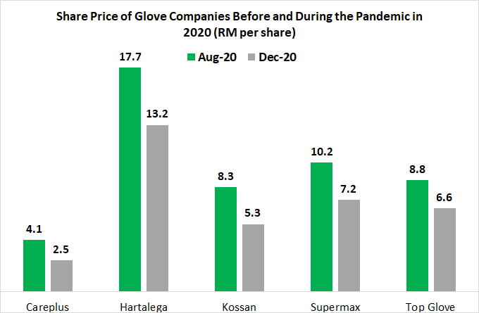 With the announcement of the vaccination program for Malaysia towards the end of 2020 and the easing of lockdowns, gloves stock prices declined from its peak but was still considered the best sector to invest in. Naturally, glove companies that had the highest increase also experienced the highest decline in share price from its peak. Careplus declined by 40%, while the other companies declined by about 25% to 30%.