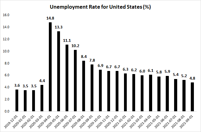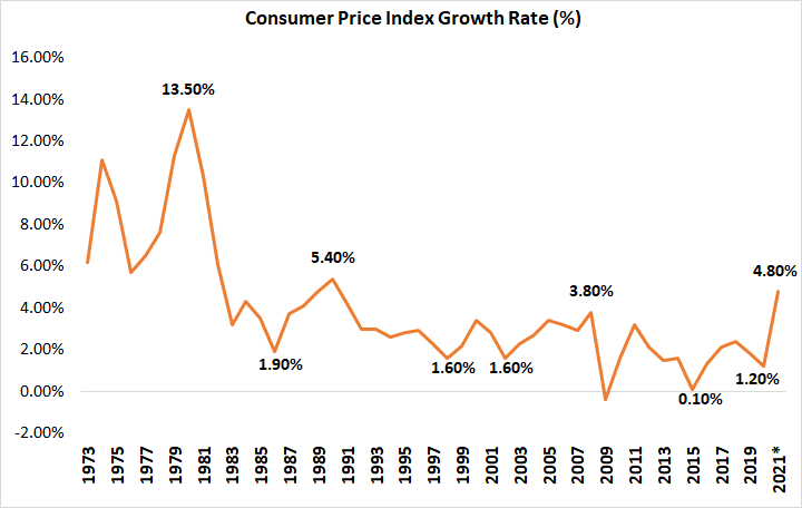 Inflation rate has been projected at 4.8% for 2021, the highest it has ever been since 1990. This is way above the 2.0% inflation target set by the FED in its mandate. However, this needs to be interpreted by the context of inflation being historically low in the 2010s due to the 2008 recession impact. In the past 5 years, inflation only averaged about 1.5% every year, way below the 2.0% inflation target. The fact is that the United States was having problems, HAVING inflation in the economy before this. The steep increase in inflation this year should be balanced by this fact and that the Covid-19 recession depressed prices also.