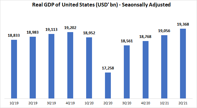How is the US economy doing then? It is recovering gradually and has surpassed 2019 levels in GDP, but they still have some catching up to do. GDP in 2Q 2021 is at $19.4 trillion, above the level of 2Q 2019 of RM18.9trln. This translates to an average growth rate of 1.3% every year. Before that, from 2015 to 2019, GDP growth averaged around 2.4% every year. While the US economy is recovering, it has shown that it is not yet growing at pre-pandemic levels.