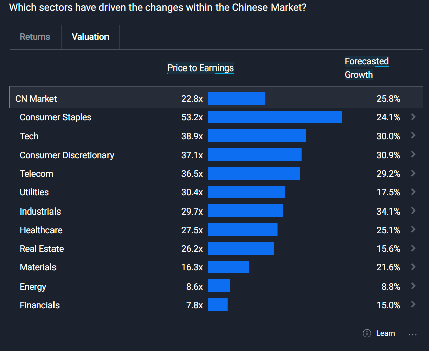 While the Chinese stock market has been on a downturn for the year, earnings of the companies are still projected to grow at a strong rate of 25.8%. For comparison, it has been growing at an average of 11% over the past 3 years. Industrials are projected to grow at the strongest rate of 34.1%, followed by Consumer (+30.9%), Technology (+30.0%), Telecommunications (+29.2%) and Healthcare (+25.1%).
