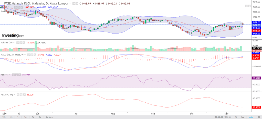 Last week’s prediction according to the technical indicators was for a downward trend. The result of that analysis was that the KLIC market was up by 2.1% for the week, which means there is some learning lessons here. The takeaway from these week is that The KLCI market is expected to be flat for the week and trade range-bound between 1440 to 1470.