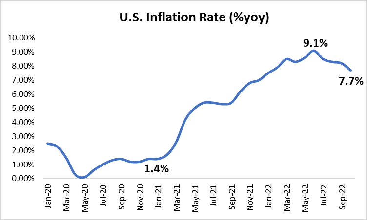 U.S. consumer price growth or inflation finally eased to 7.7% in October 2022 from 8.2% in September 2022. This has come on the back of inflation rising to as high as 9.1% in June 2022 as high crude oil and food prices from the conflict in Russia and Ukraine raised input prices for businesses and they passed on the price increase to consumers.