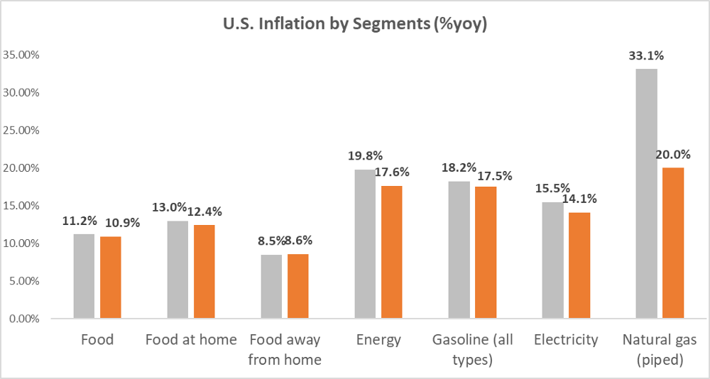 The lower inflation rate of 7.7% was driven mainly by the food and energy segments. In the food segment, food prices grew at a slower rate of 10.9% in October 2022 compared to 11.2% in September 2022, mostly driven by the moderation in food-at-home prices. In the energy segment, energy CPI moderated to 17.6% from 19.8% over the same period, due to lower gasoline and natural gas prices increase.