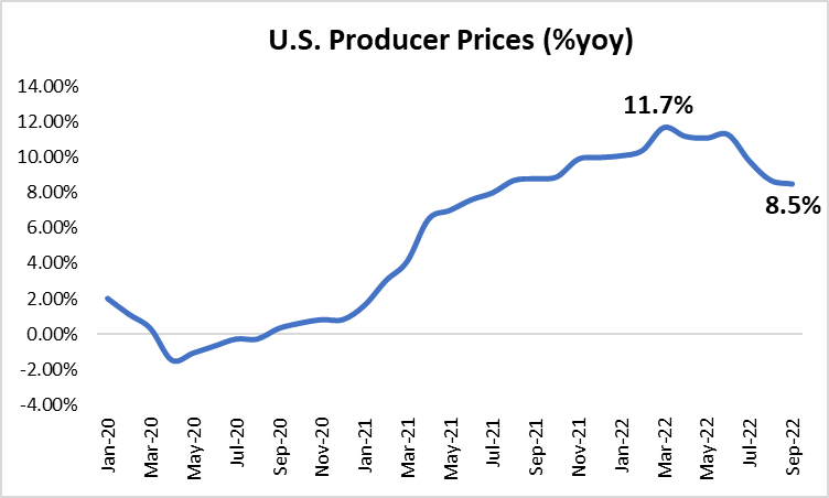 Inflation is expected to continue easing moving forward, with personal consumption expenditure (PCE) inflation expected to ease from 5.4% in 2022 to 2.8% in 2023. Producer prices have also begun to ease from their peak of 11.7% in March to 8.5% currently in September 2022.