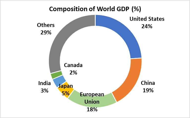 By gross domestic product, China is currently the second largest economy in the world at 19% of the world’s GDP, with United States at first at 24%. This is followed by European Union (18%), Japan (5%), India (3%), Canada (2%) and the rest of the world. Its rapid growth in the last decade has enabled China to climb the ranks to number 2 in recent years. China is expected to surpass U.S. as the biggest economy possibly by 2030.