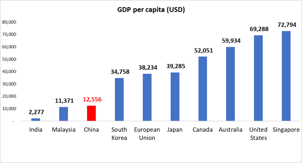 China is the second biggest economy in the world by size, but still lacks behind in per capita basis.