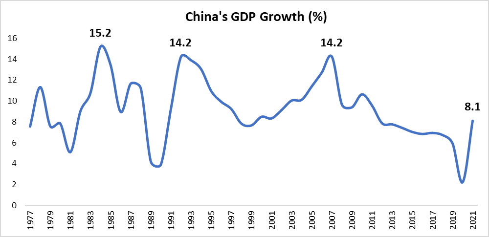 China was one of the fastest growing economies since the beginning of the 1980s, after Deng Xiaoping took over. It grew at an average rate of 9.9% from 1977 to 2010 before slowing gradually to about an average of 7.0% in the recent decade. China’s high growth was driven mainly by its manufacturing and export sectors that lead to it being called the factory of the world. It encouraged high savings by its citizens and channeled them to investments into agriculture and heavy industries, which in turn helped developed both the urban and rural areas.