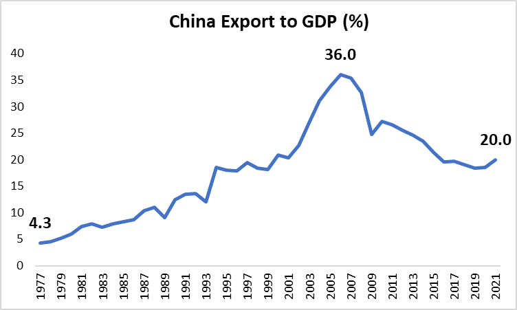 What does this mean actually? China has in the past relied on exports to drive its growth for the economy. It was when Deng Xiaoping opened up its economy for investments into manufacturing activities and spur them into the export market that China was able to achieve high economic growth. After all, most of the Chinese during that time did not have the spending power to consume whatever that was produced from China’s factories. The quickest path to growth was through the export market where both the U.S. and Europe were large consumers. This was the model implemented by most of the Asian economies during this time including Japan, South Korea, Taiwan, and many others. As a result, exports share to GDP in China increased from 4.3% in 1977 to as high as 36% in 2006.