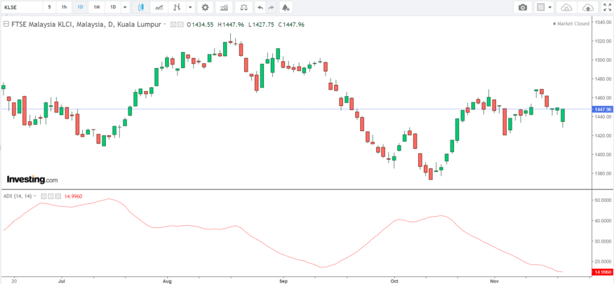 The moving average line (blue line) is indicating flat levels around the 1,450 level. The last time it flattened this way was during the August and September months, when it subsequently traded downwards because of interest rate hikes by the U.S.