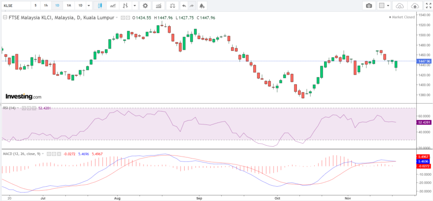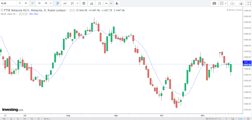 KLCI market was down by 1.3% last week, ending at 1,449 points in line with the flat trading range of 1,440 to 1,470 predicted last week. This week’s prediction would also be for a flat trading range at about 1,430 to 1,460 with a slight downward trend bias.