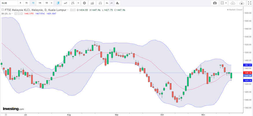 The Bollinger band has continued to narrow from last week, indicating that it could be trading at a lower range this week. The prediction here is that the range could be around 1,430 and 1,460. There could possibly be a widening of the band this week in light of the increased uncertainties arising from a hung government. Markets could move either way, with the coalitions formed between the various parties increasing the risks of policy uncertainties.