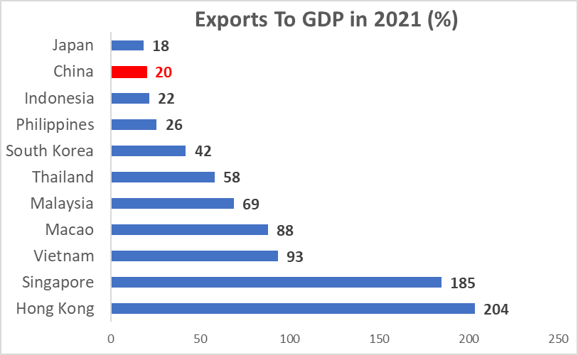 Here is a point that many don’t get it. Exports are important for China, but probably not as much as people thought. Here is a comparison of exports to the GDP of several countries in the Asia region, which measures how important exports are. Yes, China’s exports are one of the biggest in the world but are not a big portion of the Chinese economy if we look from this perspective.