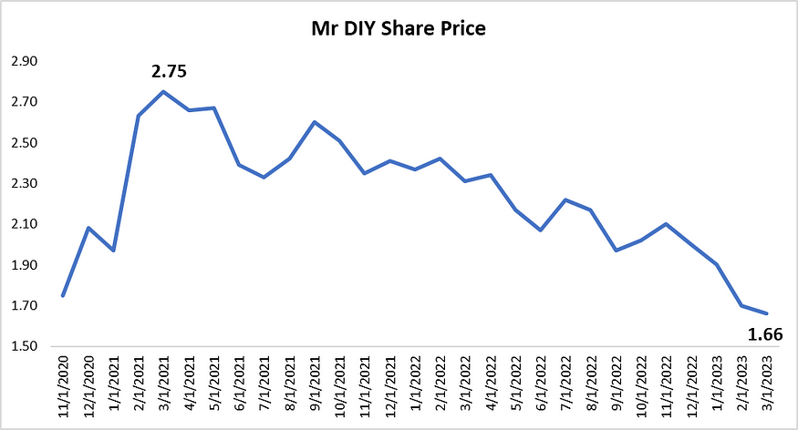October 2020. That is the month I wrote about Mr DIY here and here — a full two and a half years. What has happened since then? I did think Mr DIY was fairly valued at about RM1.60 back then when it went for an initial public offering.