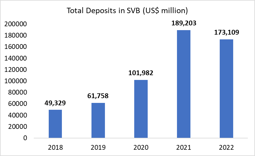 SVB’s total deposits tripled from US$61.8 billion in 2019 to US$189.2 billion in 2021. In just 2 years, SVB found themselves strapped with 3 times the amount of funds available to them.