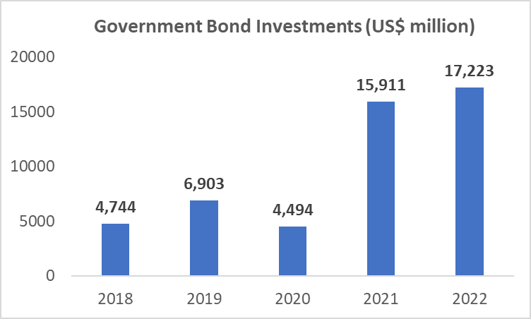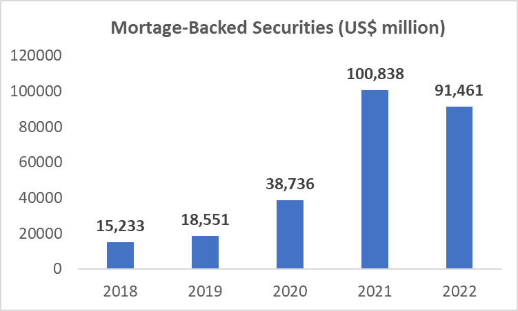 Back to the story, SVB invested most of the deposits into government bonds and surprise, surprise, mortgage-backed securities. Government bond investment increased from US$4.5 billion in 2020 to as high as US$17.2 billion in 2022. Meanwhile, mortgage-backed securities increased from US$18.6 billion in 2019 to US$100.8 billion in 2021.
