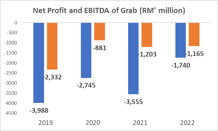 Yes, you heard that right. Grab is still making losses in its 10th year. In 2022, it made a loss of about US$1.7 billion, and surprisingly this was the smallest loss in 4 years. Oh, Grab, oh Grab. When will you ever be profitable? You made a loss of US$3.7 billion in 2019 and continued to do so in 2020 (-US$2.7 billion) and 2021 (-US$3.6 billion). Even from an EBITDA standpoint, you are still making losses.