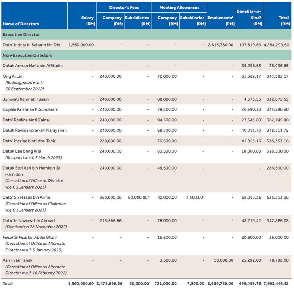 For TNB, it achieved a score of 4 which indicates that the performance of the board and its committees were satisfactory. Furthermore, it also declared that all of its directors received a total of RM8 million in salary, remunerations, and benefits from TNB. Staff cost came up to about RM3.9 billion in 2022, which means that the amount paid to board directors was not excessive. The picture below represents how much was paid to each directors.