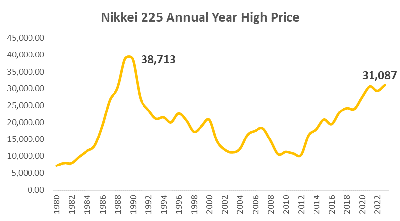 The Nikkei 225 has reached its highest level recently since 1990, when the stock market crashed in 1991, and continued to decline for 14 years to 2004. Since then, the Nikkei 225 has steadily risen back amid the appointment of Shinzo Abe as president in 2012.